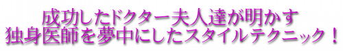 「ドクターを虜にするサクセススタイル!」が手元にあれば、成功したドクター夫人達が実践した、日ごろ一人では思いつかないような医師との結婚に関わるスタイリングの秘訣を貴女のものに出来ます!